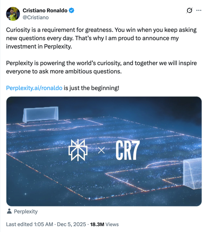 在最近的2025年12月5日,C罗正式购入美国生成式搜索独角兽Perplexity AI的股份,成为战略股东。